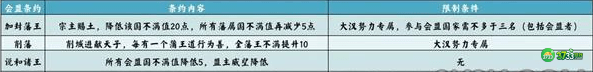 会盟取消了开启需要三种势力的条件,同时会盟条约去除了献城祝福,增加了如下条约: