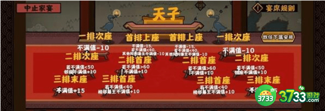 首排上座:不满值-15,若不满值<40,其他同列藩王不满值-10