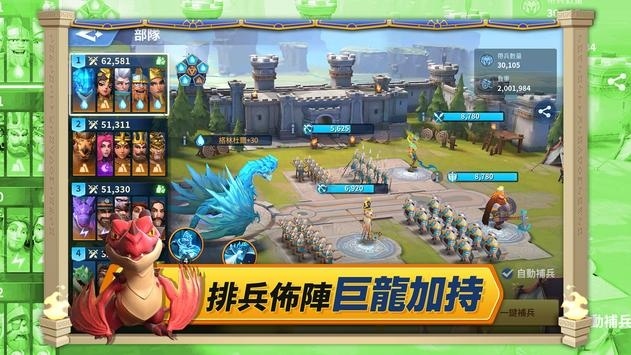3.自由发展:玩家可以自由发展自己的王国,建设城堡、研发科技、培养英雄,逐步壮大自己的势力,争夺领地的控制权。