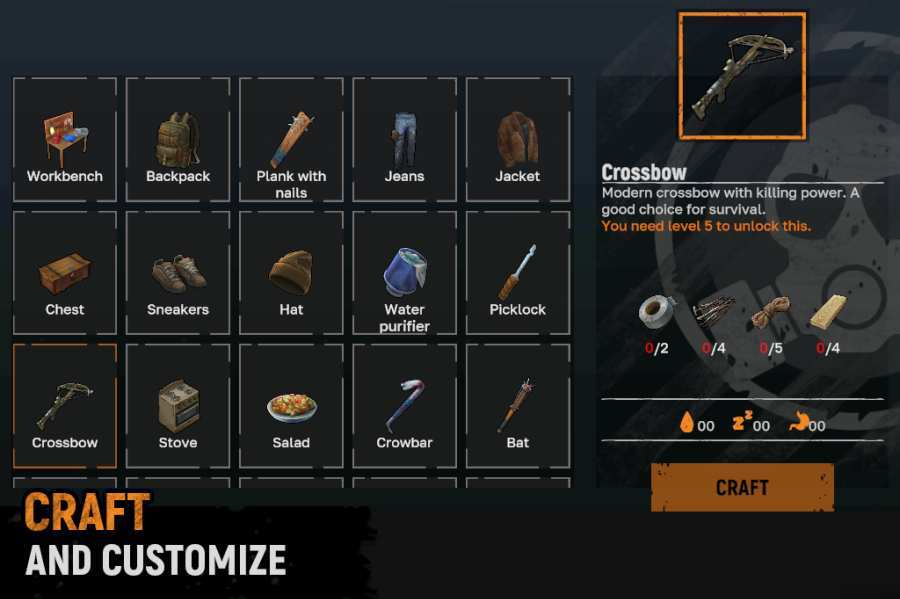 普通的生存模拟器是对物品和资源的不断搜索和收集。僵尸的生存还存在被搜寻时被咬甚至被吃掉的危险。因此,别忘了随身携带武器,否则这将是您在这个荒凉的地球上的最后一天。