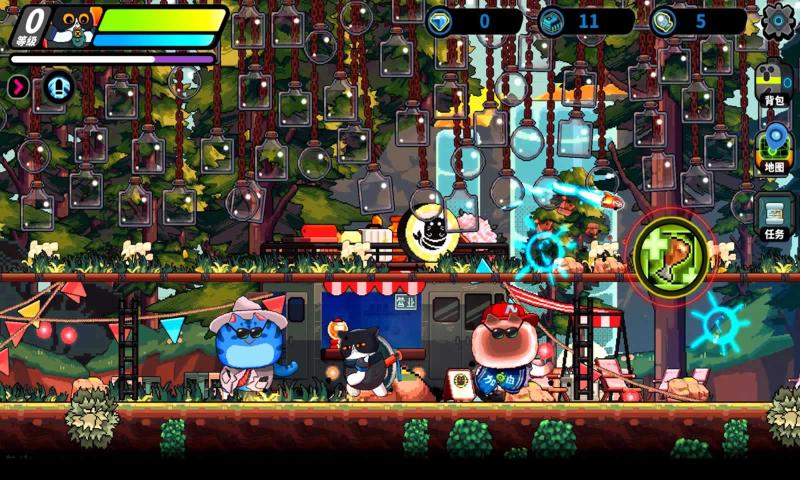 喵星猎人是一款以萌趣的喵星人为主角的横版动作射击游戏,它带领玩家进入一个由猫咪们统治的奇妙世界,让你在欢快的音乐和绚丽的色彩中展开一场惊险刺激的冒险之旅。在这个游戏中,玩家将扮演一位勇敢的喵星猎人,手持各式各样的武器,穿梭于多变的关卡之间,与邪恶的敌人战斗,拯救被囚禁的小伙伴,恢复喵星的和平与安宁。玩家可以通过简单的操作来控制喵星猎人跳跃、翻滚、射击,甚至释放强力的特殊技能。玩家还可以收集和解锁更多的武器和装备,进一步提升自己的战斗力。