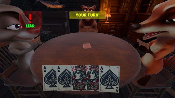 轮到自己出牌时,必须出1到3张牌,并向其他玩家形容你的牌面。其他玩家则需要猜测玩家所说的是实话还是谎言。如果认为是假的,可以选择质疑。