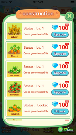2.升级等级以解锁更多农田。不同的作物和蔬菜需要不同的时间才能成熟。完成任务以获得加速道具!